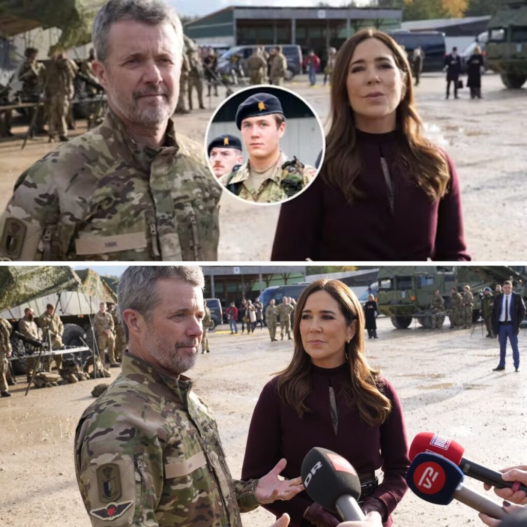 Efter besøget talte kongeparret kort med den fremmødte presse, og her faldt snakken på kronprins Christian, der selv er i gang med en militæruddannelse.