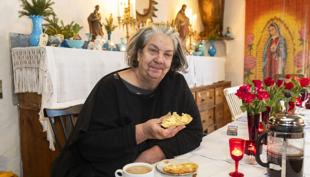 I det hyggelige køkken var der ved at blive stegt julemedister, der er lavet af gårdens egne uldsvin.