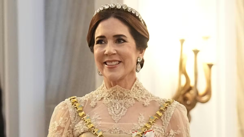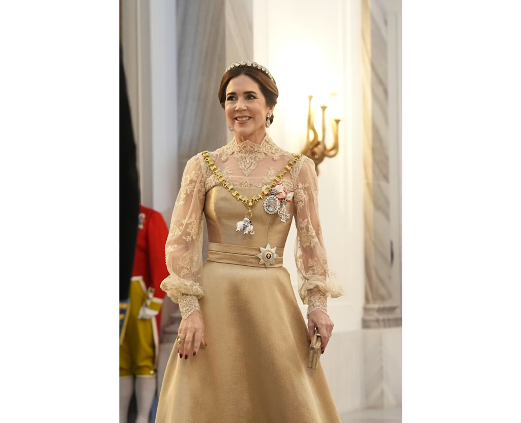 Her ses dronning Mary iført det gyldne skørt på statsbesøg til Sverige i 2024.