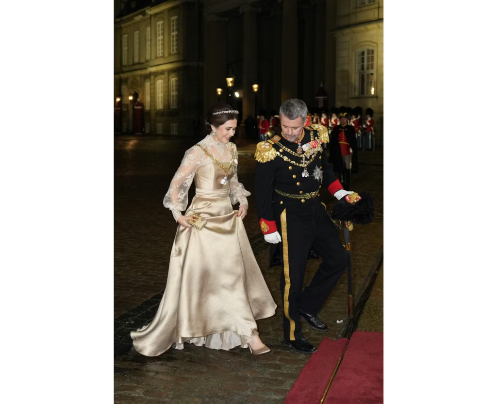 Kongeparret er aftenens værter, og dronningen var klædt i guld for alle pengene.Læs ogsåSker meget sjældent for prinsesse Marie: Var i midnatsblå velour til nytårstaffel