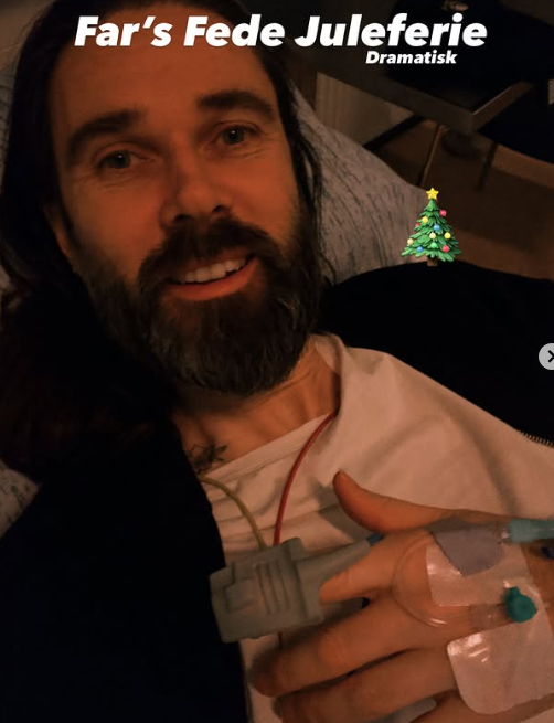“Startede dagen/natten i dag med at besvime på vores badeværelse og dunke hovedet ned i gulvet. Alt er godt og tak for hjælpen til ambulance folket og Skejby,” skriver han.