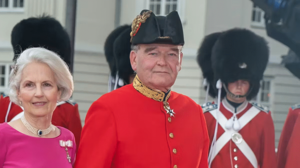 Frants Erich Bernstorff-Gyldensteen var blandt gæsterne til Frederik og Marys bryllup. Her ses han til venstre for brudeparret i mørk uniform, ved siden af sin hustru, Victoria.