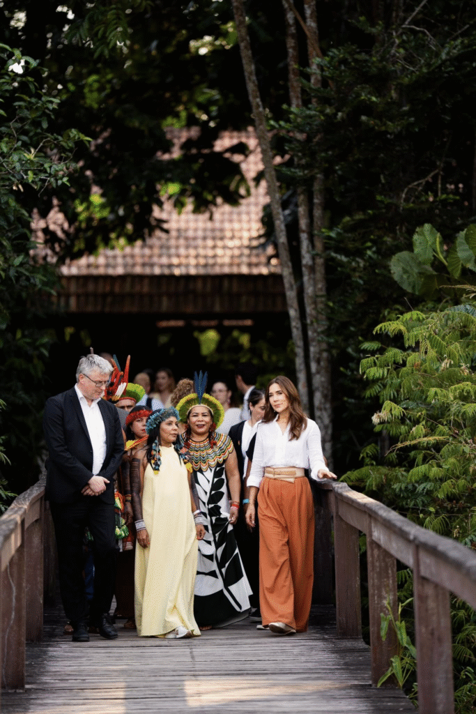 Midt i den tætte grønne skov i Utingaparken i Belém fik Hendes Majestæt Dronningen onsdag et indblik i den afgørende rolle som oprindelige folk spiller i arbejdet med at beskytte Amazonas natur og biodiversitet. Som dagens æresgæst blev Dronningen inviteret til at deltage i en traditionel dans.