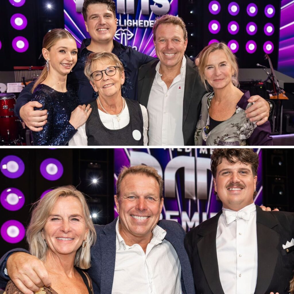 Alfred Midé Erichsen med sin forlovede Madeleine, sin mormor Sonja og sine forældre, Mikkel Beha Erichsen og Marian Midé Erichsen.