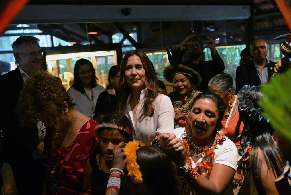 „Midt i den tætte grønne skov i Utingaparken i Belém fik Hendes Majestæt Dronning Mary på denne dag et indblik i den afgørende rolle, som de oprindelige folk spiller for at beskytte Amazoniens natur og biologiske mangfoldighed. Som dagens æresgæst blev dronningen inviteret til at deltage i en traditionel dans,“ står der under klippet.